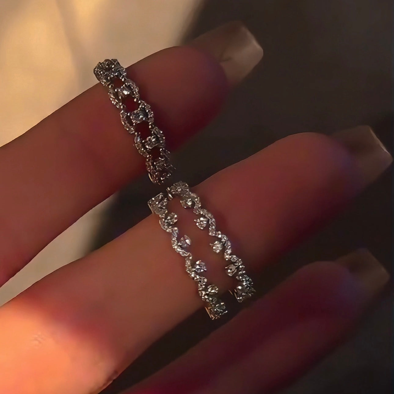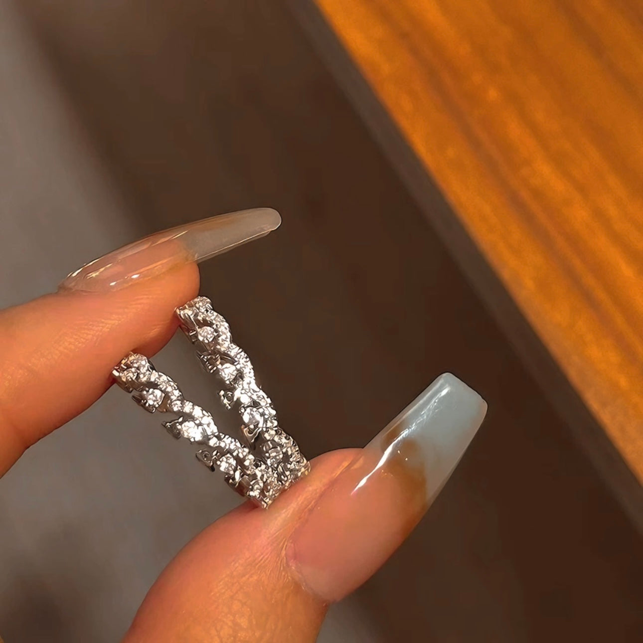 This exquisite ring showcases a delicate yet striking design, featuring a trail of marquise-cut crystals that gracefully adorn the finger. The open design gives a contemporary feel, while the sparkling crystals provide a touch of classic elegance. It's a statement piece perfect for adding a touch of glamour to any occasion.