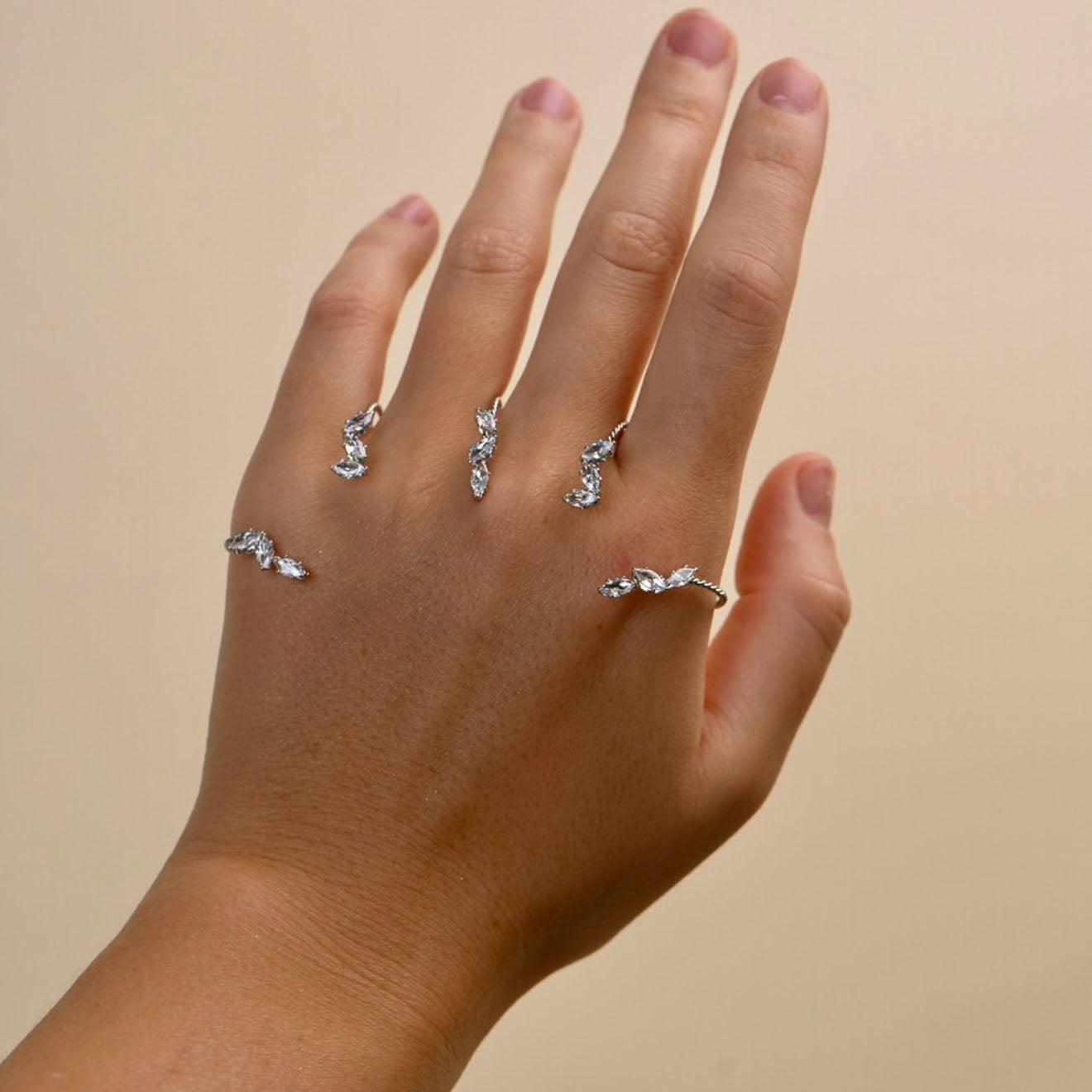 This exquisite ring showcases a delicate yet striking design, featuring a trail of marquise-cut crystals that gracefully adorn the finger. The open design gives a contemporary feel, while the sparkling crystals provide a touch of classic elegance. It's a statement piece perfect for adding a touch of glamour to any occasion.
